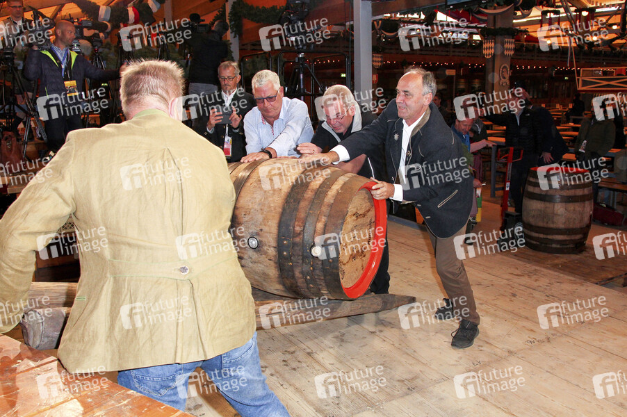Bierfässer-Aufstellen beim Wiesn Anstich zur Eröffnung vom Oktoberfest 2019 im Schottenhamel Festzelt. München, 21.09.2019