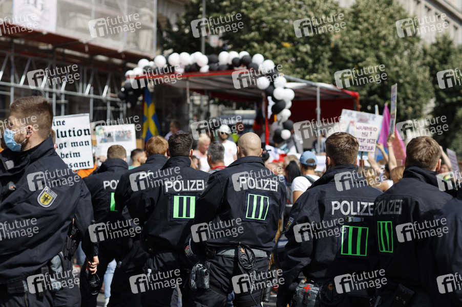 Demonstranten verschiedener Gruppierungen wie etwa der Initiative Querdenken 711 protestierten mit einer Großdemonstration in Berlin gegen die bestehenden Maßnahmen zur Eindämmung der Corona-Pandemie. Wegen Nichteinhaltung der polizeilichen Auflagen wurde die Demonstration durch die Polizei beendet. Es gab Rangeleien und Festnahmen. Berlin, 29.08.2020