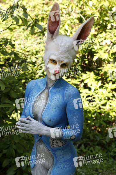 GEEK ART - Bodypainting and Transformaking: Alice im Wunderland Photoshooting mit Janina als das weiße Kaninchen im Czarnecki-Garten. Hameln, 18.05.2023 - Ein Projekt des Fotografen Tschiponnique Skupin und des Bodypainters und Transformakers Enrico Lein