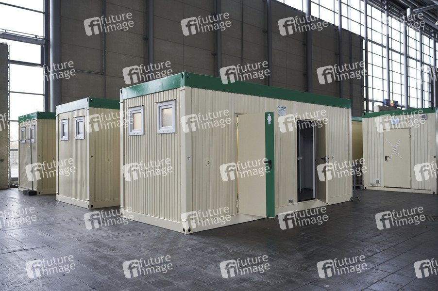Dusch- und Toilettencontainer - Zeltdörfer-Unterkünfte für ukrainische Kriegsflüchtlinge in der Halle 27 auf dem Messegelände, inklusive Wasch- und Duschmöglichkeiten, errichtet von der Feuerwehr Hannover. Die spätere Versorgung erfolgt durch das DRK. Hannover, 06.03.2022
