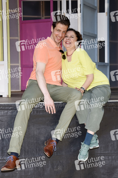 Sebastian Waldemer und Franziska Traub bei der Fotoprobe zum Theaterstück 'Ungeheuer heiß' auf der Freiluftbühne im Gastgarten Siebenbrunn. München, 27.07.2021