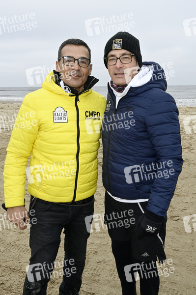 Erol Sander und Jan Sosniok beim 9. Baltic Lights 2025 Charity-Schlittenhunderennen zu Gunsten der Welthungerhilfe zwischen der Seebrücke Ahlbeck und der Seebrücke Heringsdorf. Heringsdorf, 01.03.2025