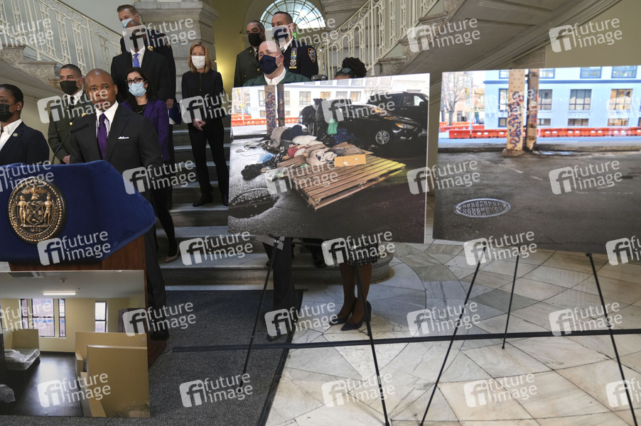 Bürgermeister Eric Adams bei einer Pressekonferenz zum Thema Obdachlosigkeit im Rathaus. New York, 30.03.2022