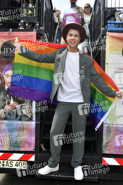 Maximillian Seitz auf dem JFMS Truck von Julian F. M. Stoeckel bei der 44. Christopher Street Day Parade 2022 unter dem Motto 'United in Love! Gegen Hass, Krieg und Diskriminierung' vom Spittelmarkt auf gut sieben Kilometern über Potsdamer Platz und Potsdamer Straße zum Nollendorfplatz, von dort weiter zur Siegessäule und zum Brandenburger Tor. Berlin, 23.07.2022