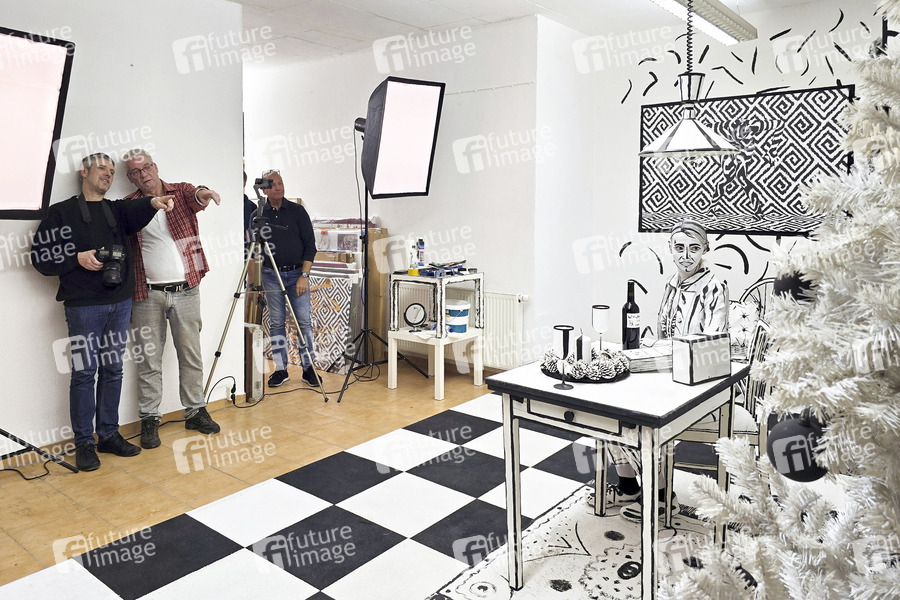 (Black and) White Christmas Photoshooting mit Model Tina, Fotograf Tschiponnique Skupin und Künstler Jörg Düsterwald im Atelier Düsterwald. Hameln, 08.12.2024 - Bodypainting und Kulisse von Jörg Düsterwald