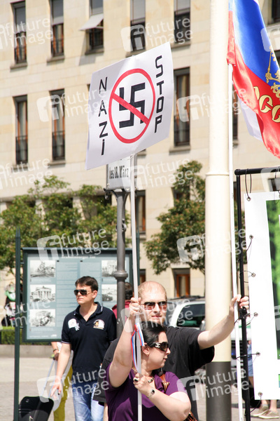 Die Organisation 'Staatenlos' veranstaltet eine russische-ukrainische Friedensdemonstration vor dem Brandenburger Tor. Berlin, 25.05.2014 'Staatenlos' ist eine Organisation von wenigen Menschen, unter Leitung von Rüdiger Klasen, die der Ansicht sind, das es sich bei der BRD um eine GmbH, geleitet durch die USA handelt. Sie arbeiten eng mit den sogenannten Reichsbürgern zusammen. Beide Gruppen lehnen die Regierung, die Gerichte sowie die Polizei in der BRD ab da sie diese für rechtswidrig halten.