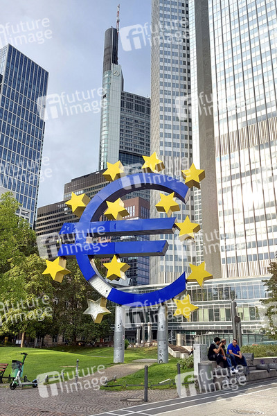 Symbolfoto Eurokrise - beschädigte Euro-Skulptur am Willy-Brandt-Platz. Frankfurt, 08.09.2021