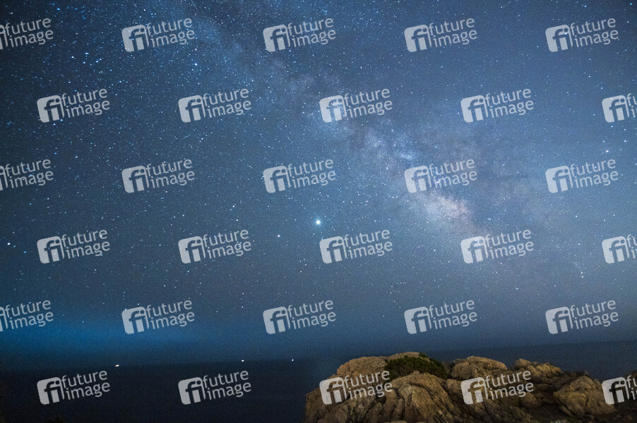 Die Milchstraße über Cala Rajada. Das Milchstraßensystem besteht aus etwa 100 bis 300 Milliarden Sternen und großen Mengen interstellarer und Dunkler Materie. Cala Rajada, 20.07.2020
