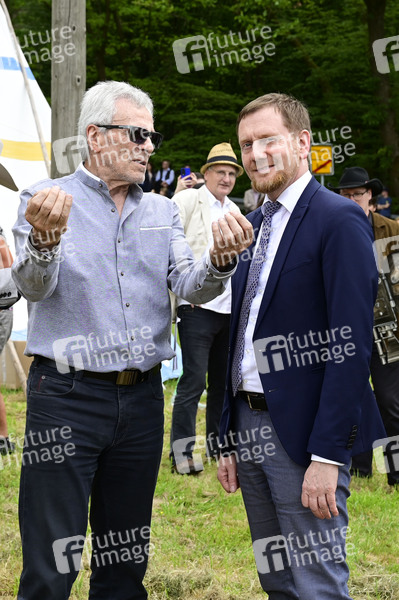 Gojko Mitic und Michael Kretschmer bei der offiziellen Einweihung einer Sandstein-Stele in der Nähe des Originaldrehortes des Filmes 'Die Söhne der großen Bärin' im Kurort Rathen. Rathen, 19.05.2024