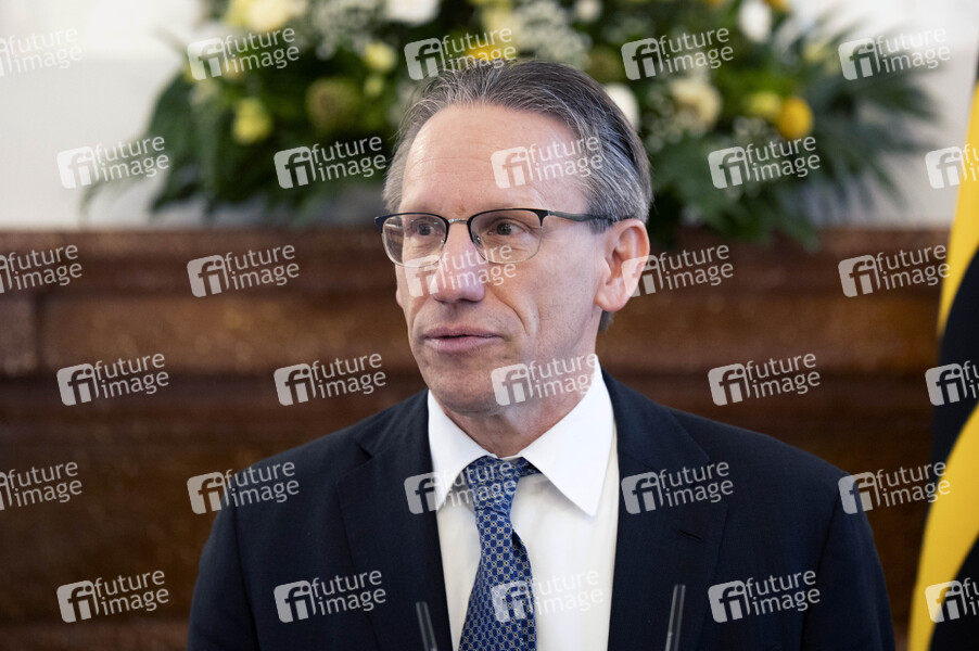 Jörg Kukies bei der Übergabe der Wohlfahrtsmarken 2025 durch den Bundesminister der Finanzen an den Bundespräsidenten im Schloss Bellevue. Berlin, 21.02.2025