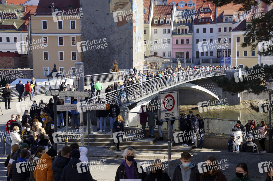 Initiiert vom Görlitzer Augustum-Annen-Gymnasium fanden sich ca. 1.000 Menschen zu einer grenzüberschreitenden Menschen-Kette zusammen, ausgehend von der Altstadtbrücke in beide Richtungen nach Zgorzelec und Görlitz. Mit dabei waren der Görlitzer Oberbürgermeister Octavian Ursu, sein Zgorzelecer Amtskollege Rafal Gronicz und Marcin Król, der Konsul der Republik Polen in Berlin. Görlitz, 09.03.2022
