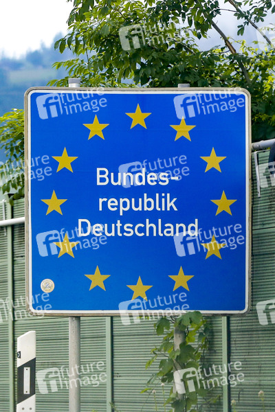 12 gelbe Sterne, blau-gelb, Border Federal Republic of Germany, Bundesgrenze, Grenzbereich Deutschland, Grenze, Grenzübergang, Straßenschild, Verkehrsschild, EU, Europäische Union, European Union, Symbolbild, hemenbild