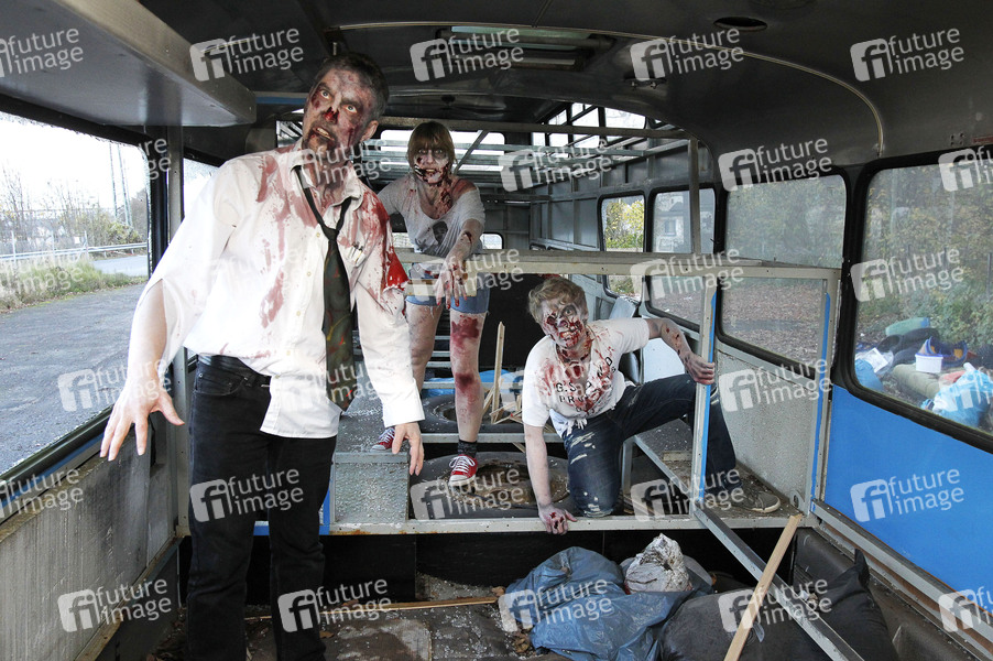 GEEK ART - Bodypainting meets SciFi, Fantasy and more: Zombie Photoshooting mit Tschiponnique, Maria und Paul als Zombies in einem Buswrack in Rohrsen - Ein Projekt des Fotografen Tschiponnique Skupin, Painting: Enrico Lein und Jörg Düsterwald