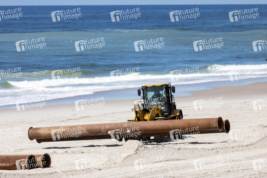 Die Sylter Küste ist der Gewalt des Meeres ständig unmittelbar ausgesetzt. Bei einer Sandvorspülung wird Sand aus tieferen Meeresbereichen oder anderen Quellen entnommen und auf die Strände aufgespült. Dieses Verfahren hilft nicht nur, den Strand zu verbreitern, sondern verstärkt auch den natürlichen Schutz gegen das Meer. (Symbolfoto, Themenfoto) Wenningstedt-Braderup, 08.09.2024