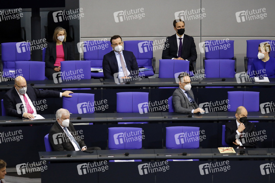 Peter Altmaier, Horst Seehofer, Jens Spahn, Heiko Maas, Olaf Scholz und Franziska Giffey in der 209. Sitzung des Deutschen Bundestages im Reichstagsgebäude. Berlin, 11.02.2021