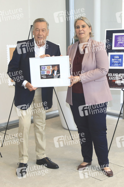 Roland Kaiser und Nikola Hagleitner bei der Vorstellung der Roland Kaiser-Briefmarken. Anlässlich seines Bühnenjubiläums 'RK50 I 50 Jahre – 50 Hits' ehrt die Deutsche Post den erfolgreichsten Interpreten im Schlagergenre, Roland Kaiser, mit eigenen Briefmarken. Deutsche Post Zentrale, Post Tower. Bonn, 11.07.2024