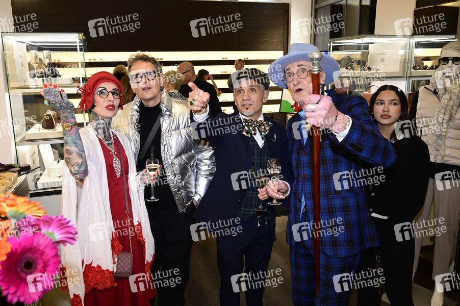 Sarah Settgast, Rolf Scheider, Carlos Eduardo Davila Federico und Günther Krabbenhöft bei der Präsentation der neuen exclusiven 'Sarah Settgast Kollektion by Hoffmann Natural Eyewear Kollektion' im Noble Optic House im Maybach Store Kurfürstendamm. Berlin, 29.11.2024