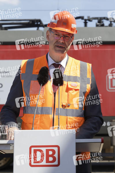Patrick Schnieder bei der Vorstellung der ersten Güterzuglokomotive, die für den automatisierten Streckenbetrieb umgerüstet wurde im DB Cargo-Werk Köln-Gremberg. Köln, 04.07.2025