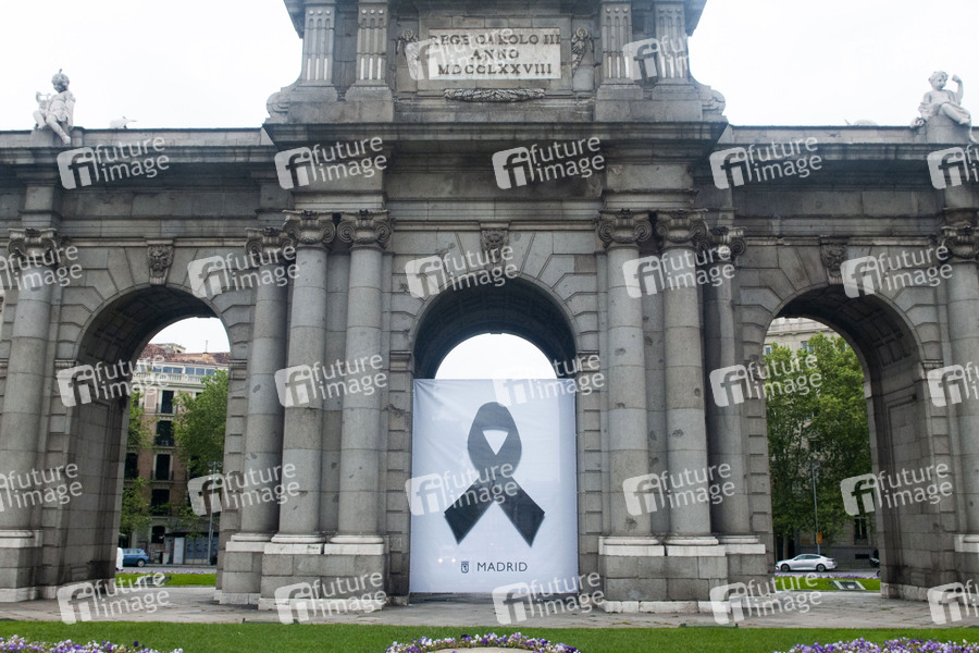 Schweigeminute für die Covid-19 Opfer an der Puerta de Alcalá am 40. Tag seit Verhängung des Ausnahmezustands durch die spanische Regierung wegen der Coronakrise. Madrid, 23.04.2020