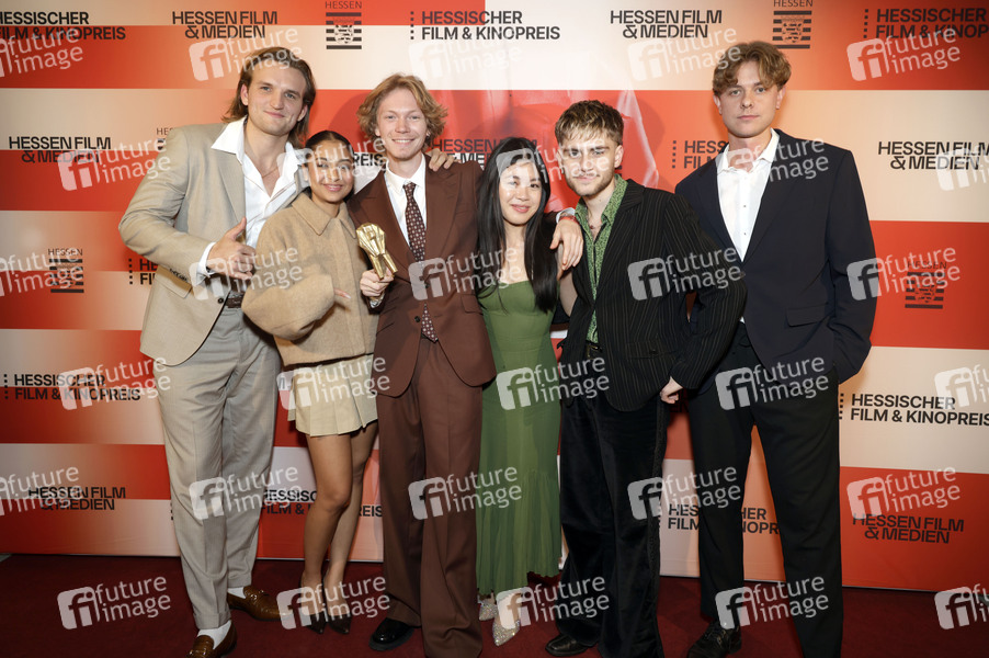 Ludger Bökelmann, Samirah Breuer, Filip Schnack, Tanya Nguyen, Florian Geißelmann und Jonas Ems bei der 36. Verleihung des Hessischen Film- und Kinopreises 2025 in der Alten Oper. Frankfurt am Main, 17.10.2025