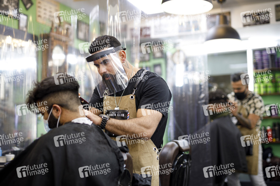 Barber, Barbier, Barber-Shop, Barber-Shops, Friseur, Friseure, Corona-Maßnahmen, Coronakrise, Corona-Krise, Schutzkleidung, Spritzschutz, Frisör, Salon, Bart schneiden, Bartschnitt, Haare schneiden, Haarschnitt, Fönen, Waschen, Legen, Corona, Virus, Sars-CoV-2, Covid-19, Coronavirus, Corona-Virus, Coronaviren, Corona-Viren, Pandemie, Epidemie, RKI-Zahlen, Neuansteckungen, Corona-Lockerungen, zurück zur Normalität, Corona-Schutz, Exit-Strategie, Friseurbesuch, Ausnahmesituation, Atemschutz, Atemschutzmaske, Virenschutz, Schutzmaske, Schutzmasken, Atemschutzmasken, Maske, Masken, Mundschutz, Mund-Schutz, Mundschutzpflicht, Maskenpflicht, Mundschutz-Pflicht, Mund-Nase-Schutz, Mund-Nasen-Schutz, MNS, Corona-Regeln, Symbolbild, Symbolfoto