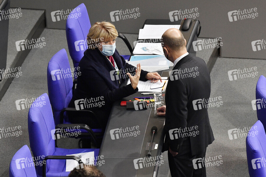Monika Grütters und Olaf Scholz in der 215. Sitzung des Deutschen Bundestages im Reichstagsgebäude. Berlin, 04.03.2021