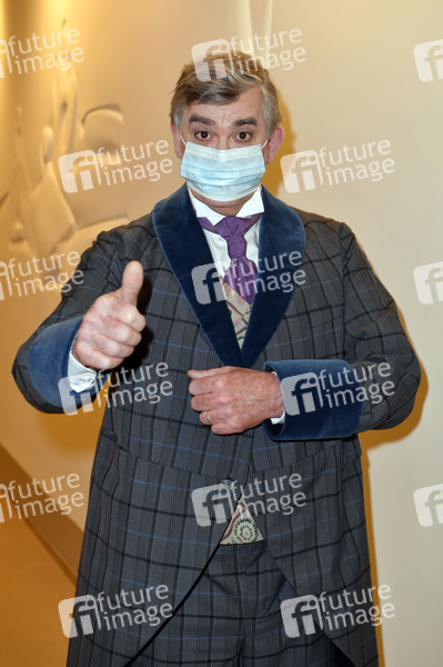 Dirk Schoedon beim Fototermin mit dem (getesteten) Ensemble des Theaterstücks 'Vorhang auf für Cyrano' in Maske und Kostüm vor dem Testzentrum im Schiller Theater. Unter dem Motto 'Testen statt spielen' eröffnen die Komödie am Kurfürstendamm und der KitKatclub ein gemeinsames Testzentrum im Schiller Theater. Berlin, 07.04.2021