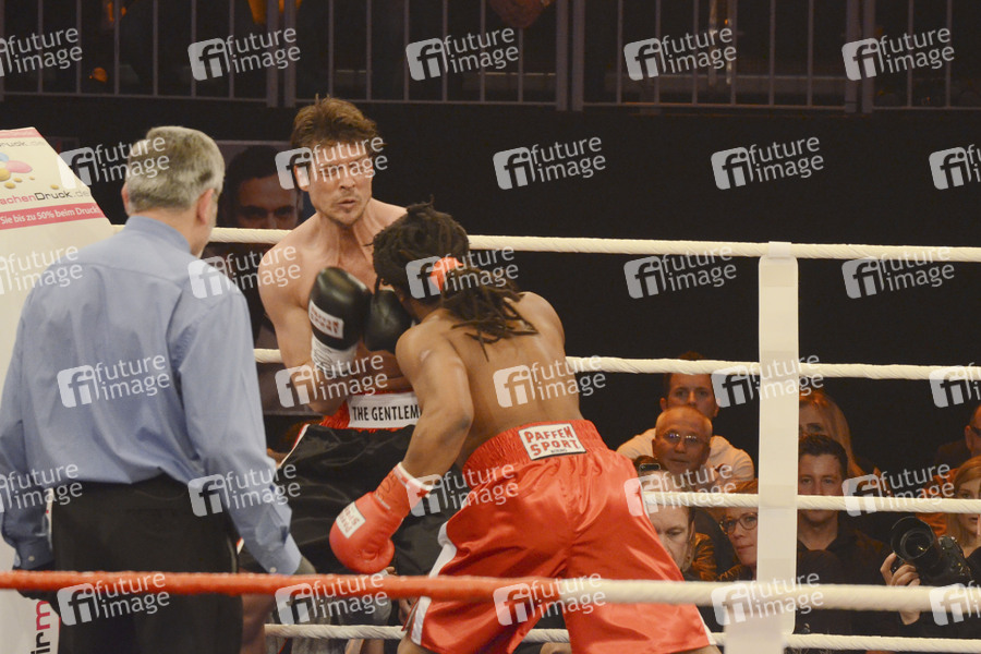 Sebastian Deyle vs. Mola Adebisi bei der Fernsehshow 'Das große Sat.1 Promiboxen 2013' im Castello. Düsseldorf, 08.03.2013
