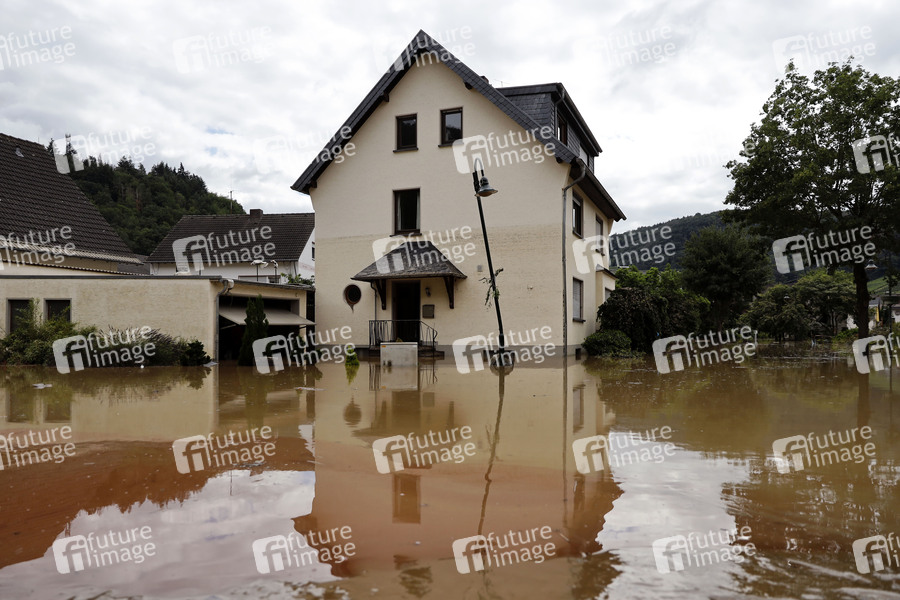 In der Eifel haben heftige Regenfälle und Dauerregen für Überschwemmungen und Überflutungen gesorgt. Im Ahrtal trat der Fluss vielerorts über die Ufer und überschwemmte nicht nur Keller sondern ganze Ortschaften. Im Bild der Ort Dernau (Landkreis Ahrweiler), der beinahe komplett von den Wassermassen geflutet wurde. Viele Menschen verloren alles. Dernau, 15.07.2021