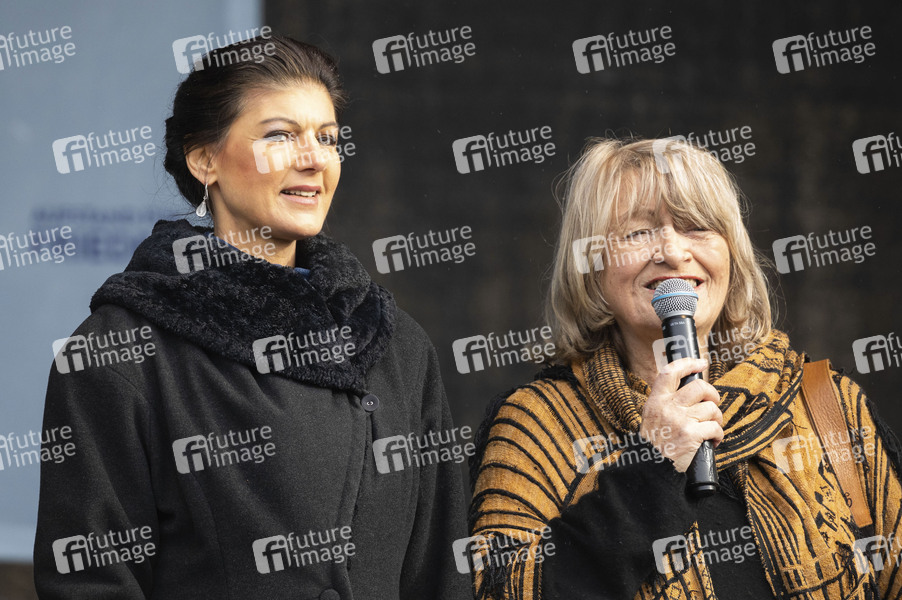 Sahra Wagenknecht und Alice Schwarzer auf der umstrittenen Friedensdemo und Kundgebung für Verhandlungen mit Russland statt Waffenlieferungen für die Ukraine am Brandenburger Tor. Dazu aufgerufen haben die Linken-Politikerin Sahra Wagenknecht und die Frauenrechtlerin Alice Schwarzer. Berlin, 25.02.2023