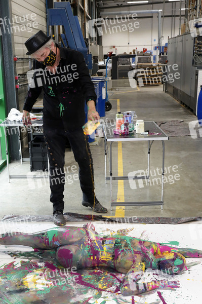 Jörg Düsterwald, einer der bekanntesten Bodypainting- und Bodyartkünstler Deutschlands macht auf seine ganz eigene Art auf die prekäre Situation freischaffender Künstler während der Corona-Pandemie aufmerksam: Unter dem Hashtag #WirzeigenFarbe hat der Hamelner Künstler in der Produktionshalle der Druckerei QUBUS media mit seinem Model Lisa ein ausdruckstarkes Live-Bodypainting inszeniert - denn Künstlerinnen und Künstler wie er sehen und fühlen sich derzeit wortwörtlich 'ausgezogen bis aufs letzte Hemd'. Und nichts symbolisiert diesen bekannten Spruch besser als ein Bodypainting auf nackter Haut in einer Umgebung, in der es jeden Tag um Farbe geht. Die Live-Performance fand mit dem zeitgleichen Druckstart von Jörg Düsterwald's neuem Premiumkalender 'Bodypainting in Nature 2021' statt. Hannover, 14.07.2020