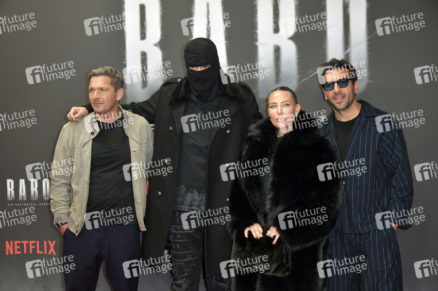Paco-Luca Nitsche, Aykut Anhan aka Haftbefehl, Nina Anhan und Elyas M'Barek beim Special Screening des Netflix Dokumentarfilms 'Babo - Die Haftbefehl-Story' in der Astor Film Lounge. Berlin, 24.10.2025