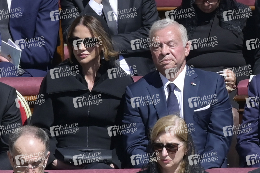 Rania von Jordanien und König Abdullah II. bin al-Hussein bei der Trauermesse für den verstorbenen Papst Franziskus auf dem Petersplatz. Vatikanstadt, 26.04.2025
