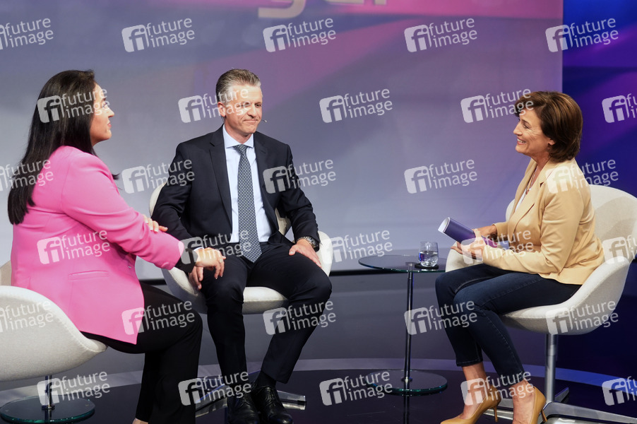 Sevim Dagdelen, Thorsten Frei und Sandra Maischberger in der ARD-Talkshow 'maischberger' im Studio Berlin Adlershof. Berlin, 24.09.2024
