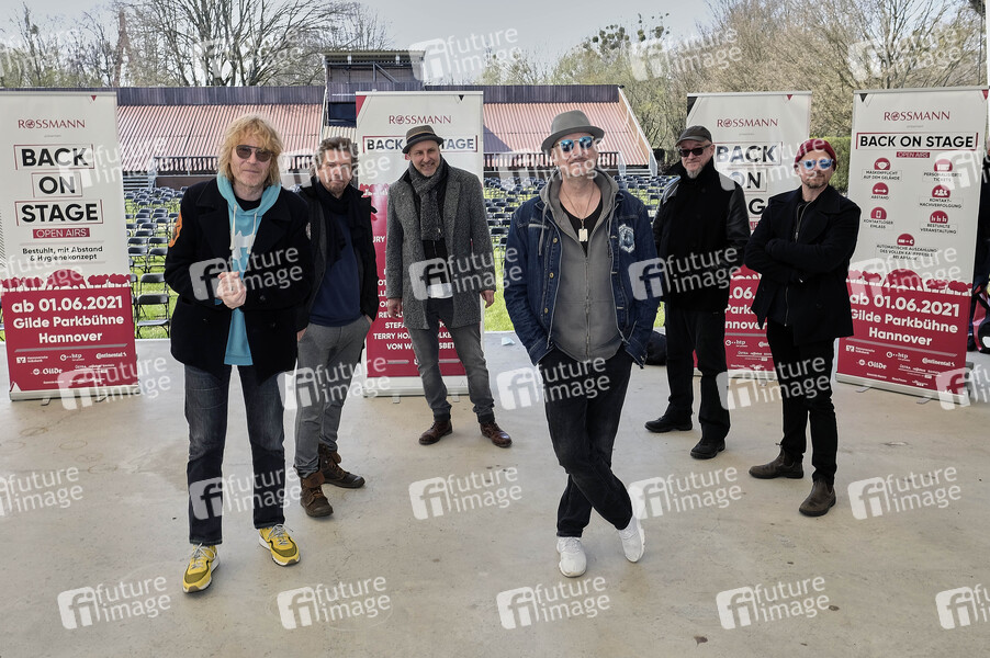 Christof Stein-Schneider, Rainer Schumann, Thorsten Wingenfelder, Kai Wingenfelder, Gero Drnek und Christian Decker beim 'Back on Stage'-Pressetermin von Hannover Concerts zur Vorstellung vom Konzertsommer 2021 mit Fury in the Slaughterhouse auf der Gilde Parkbühne. Hannover, 16.04.2021