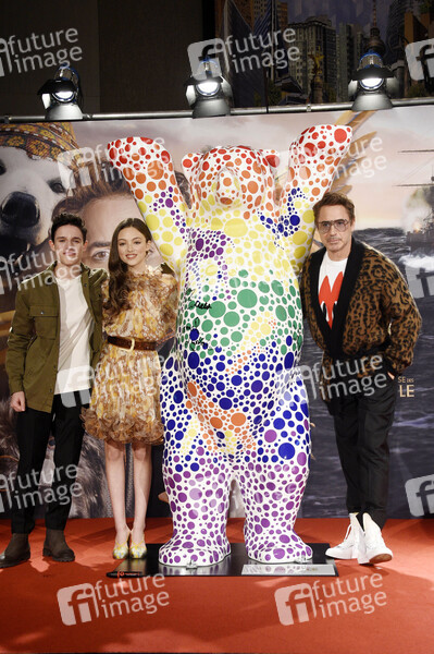 Harry Collet, Carmel Laniado und Robert Downey Jr. beim Signieren eines Buddy Bären während der Pressekonferenz zum Kinofilm 'Die fantastische Reise des Dr. Dolittle' im Waldorf Astoria Hotel. Berlin, 20.01.2020