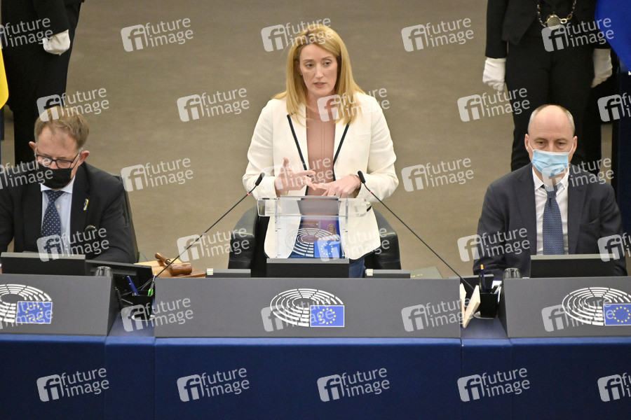 Parlamentspräsidentin Roberta Metsola bei einer Plenartagung im Plenarsaal des Europäischen Parlaments. Straßburg, 04.04.2022