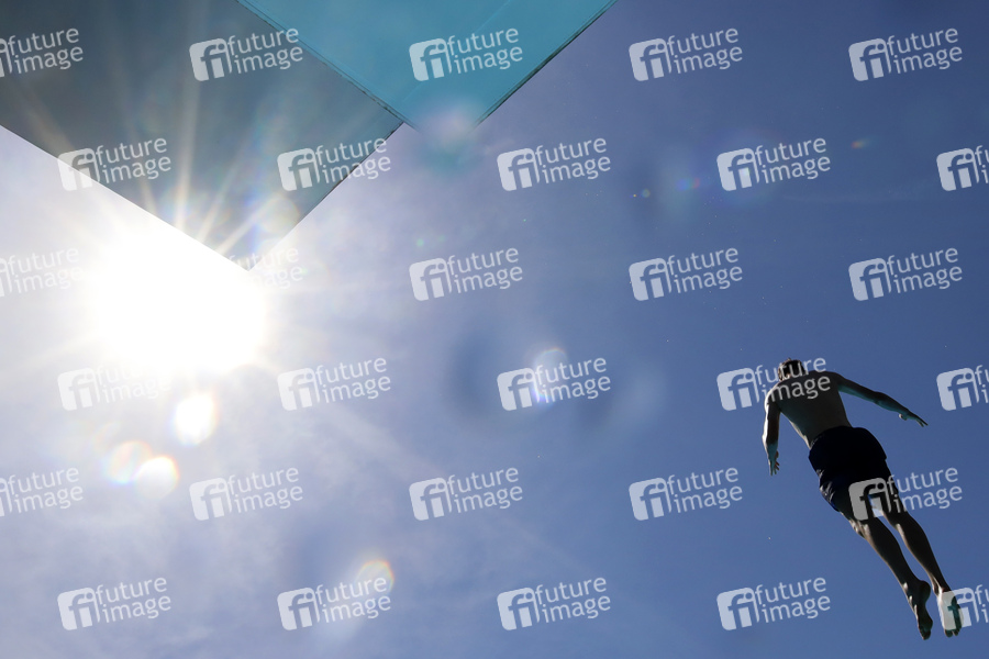 Im Kölner Stadionbad genießen Badegäste den Beginn der Freibad-Saison und springen vom Sprungturm (7,5m) ins Sprungbecken. Unter Einhaltung der Corona-Regeln dürfen Badgäste einen festen Slot buchen und in dem Zeitraum ohne Maske baden. (Themenbild, Symbolbild) Köln, 19.05.2021