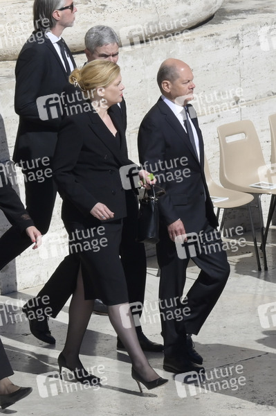 Julia Klöckner und Olaf Scholz bei der Trauermesse für den verstorbenen Papst Franziskus auf dem Petersplatz. Vatikanstadt, 26.04.2025