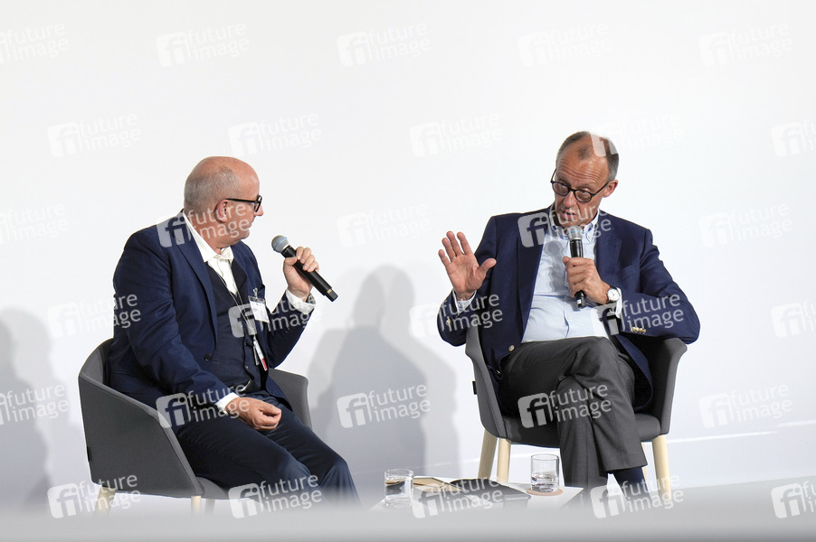 Friedrich Merz im Talk mit Eberhard Heck zur Feier 75 Jahre Grundgesetz im Paul-Löbe-Haus. Berlin, 25.05.2024