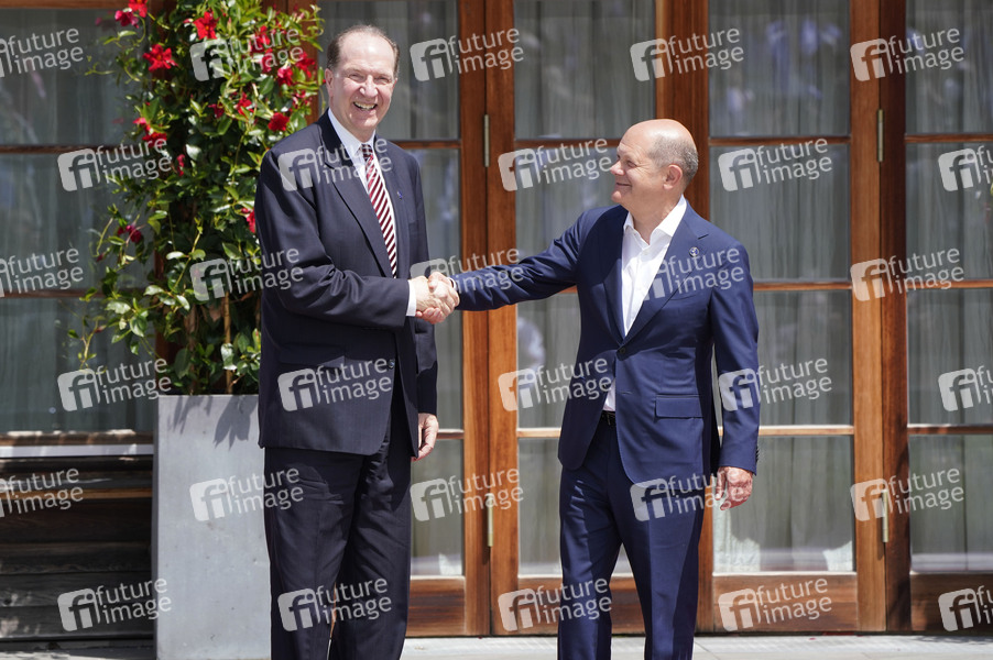 David Malpass beim Fototermin zum erweiterten Familienfoto im Rahmen der Outreach-Arbeitssitzung am zweiten Tag des G7-Gipfels auf Schloss Elmau. Die Staats- und Regierungschefs der G7-Gruppe kommen offiziell unter dem Motto 'Fortschritt hin zu einer gerechten Welt' zusammen und werden globale Themen wie Krieg, Klimawandel, Hunger, Armut und Gesundheit diskutieren. Der Gipfel wird vom anhaltenden russischen Krieg gegen die Ukraine überschattet. Klais, 27.06.2022