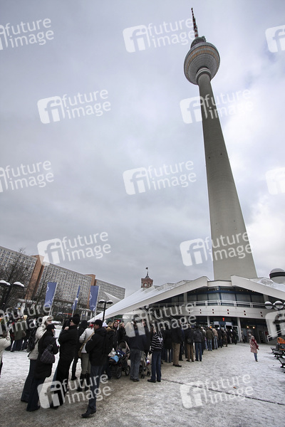 Trotz Frost lange Warteschlange vor dem Berliner Fernsehturm am Alexanderplatz. Berlin, 03.01.2009