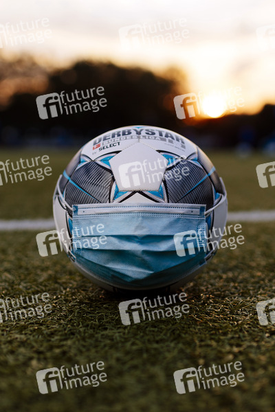 Der offizielle Spielball der Bundesliga Derbystar liegt mit Mundschutz auf einem Fußballplatz. Königsdorf, 02.09.2020