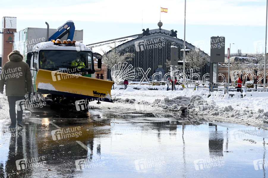 Bahnhof Madrid Atocha - Die Region Madrid nach dem Sturmtief Filomena, das in weiten Teilen Spaniens mit starken Schneefällen für Chaos sorgte. Starker Schneefall legte das öffentliche Leben nahezu lahm. Seit 50 Jahren hatte es nicht so geschneit. Madrid, 10.01.2021