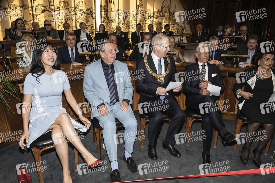 Schröder-Kim So-yeon, Gerard Schröder, Stefan Schostok, Madrid Samii und Mashid Samii beim Empfang zum 75. Geburtstag von Ehrenbürger und Bundeskanzler a.D. Gerhard Schröder im Neuen Rathaus. Hannover, 24.04.2019