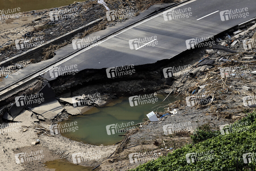 Nach dem Jahrhunderthochwasser in der Eifel durch heftige Regenfälle und Dauerregen mit Überschwemmungen und Überflutungen haben die Aufräumarbeiten im Ahrtal begonnen. Einheiten von Polizei, THW, Bundeswehr und Feuerwehr mitsamt vielen freiwilligen Helfern räumen Straßen, entfernen Schutt und Schlamm und versorgen die Menschen. Im Bild die zerstörte Bahnstrecke und Straße bei der Ortschaft Rech, in der die Flut viele Häuser zerstörte, 22.07.2021