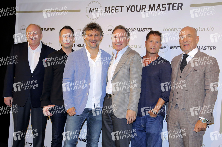 Alfons Schuhbeck, Sebastian Fitzek, Nico Hofmann, Heiner Lauterbach, Til Schweiger und Jonas Kaufmann beim Photocall zum 'Meet Your Master' Launch-Event im Hotel Bayerischer Hof. München, 21.10.2019