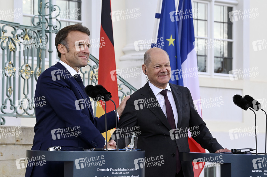 Emmanuel Macron und Olaf Scholz beim Treffen des Deutsch-Französischen Ministerrats im Gästehaus der Bundesregierung Schloss Meseberg. Meseberg, 28.05.2024