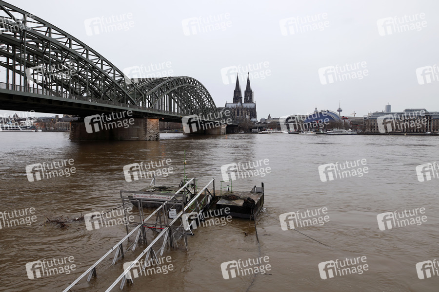 Bei steigendem Pegel von mittags 6,2 Meter umspült der Rhein bereits die untersten Stufen des gesperrten Rheinboulevard und mehrere Fähranleger am Kölner Rheinufer. Die Schifffahrt ist ab jetzt eingeschränkt. Köln, 30.01.2021