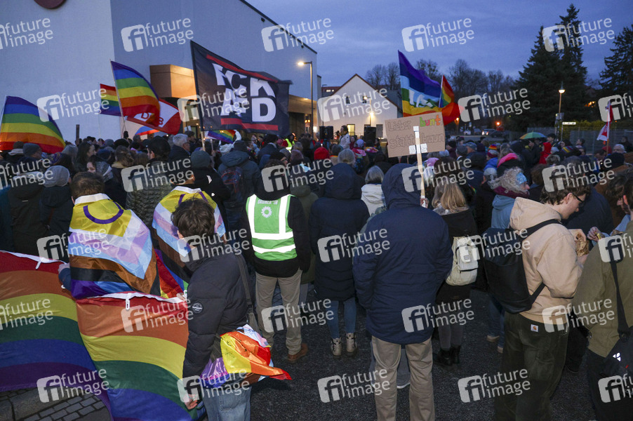 Demo vor der Stadthalle Falkensee. In einem Antrag forderte die AfD Falkensee ein Verbot für das Hissen der Regenbogenflagge an öffentlichen Plätzen und Gebäuden der Stadt. Ein breites Bündnis aus Vereinen, Jugendgruppen, Kirchenvertretern und Initiativen reagierte darauf mit Widerstand. Mit deutlicher Mehrheit haben die Stadtverordneten den Antrag der AfD abgelehnt. Falkensee, 29.01.2025